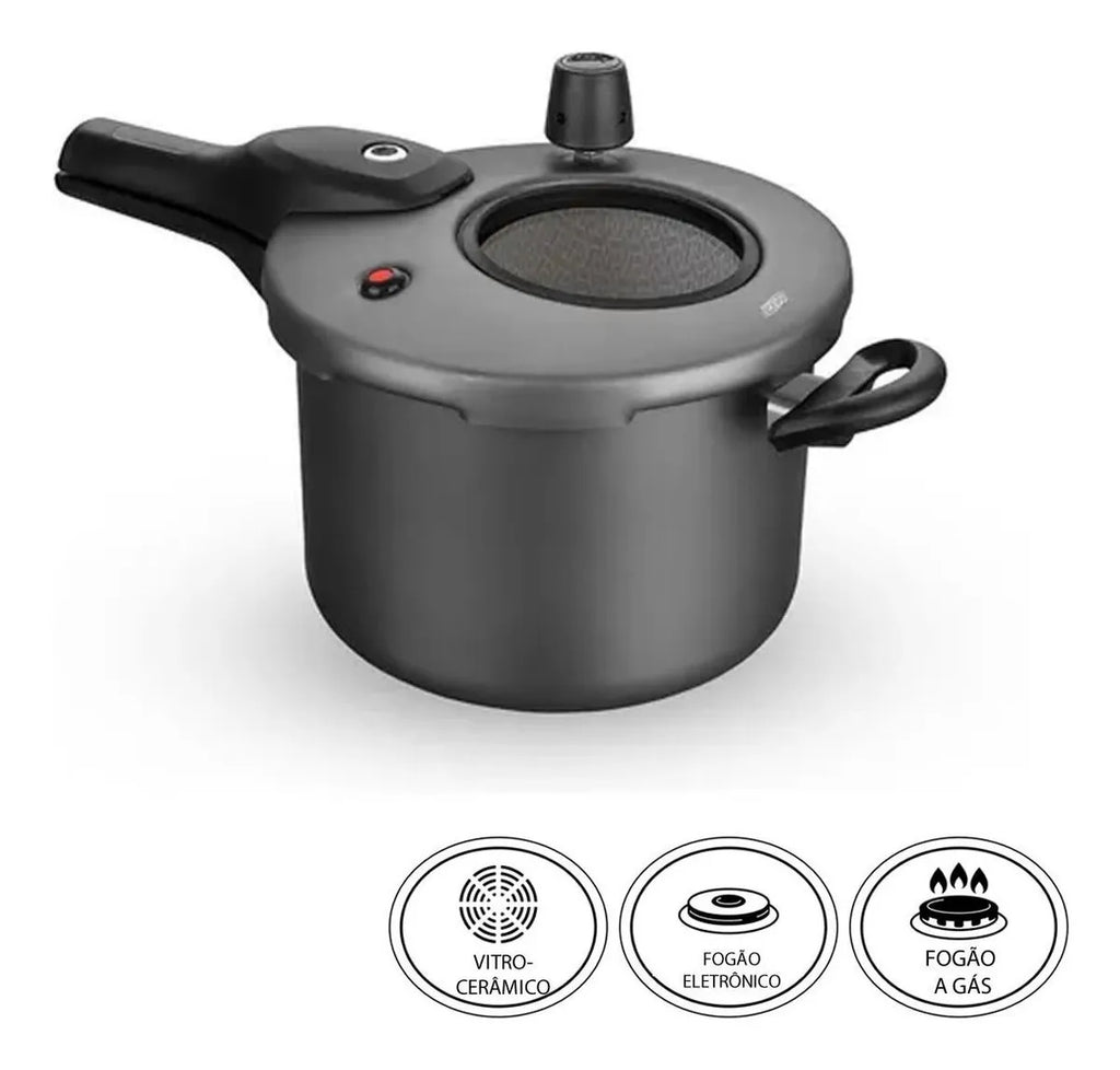 O grande diferencial está no visor de vidro temperado na tampa, que permite acompanhar o cozimento dos alimentos sem precisar abrir a panela, mantendo a pressão interna e garantindo resultados mais saborosos e seguros.