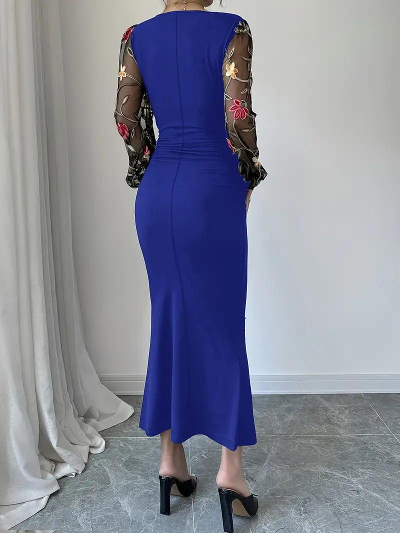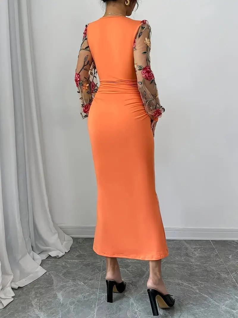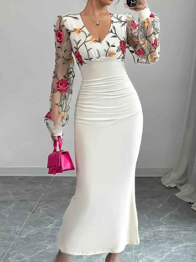 O Vestido Slim Fit combina o charme do tule bordado floral com a elegância da modelagem justa e decote em V. Um look perfeito para quem deseja destacar suas curvas com classe e conforto em momentos especiais.